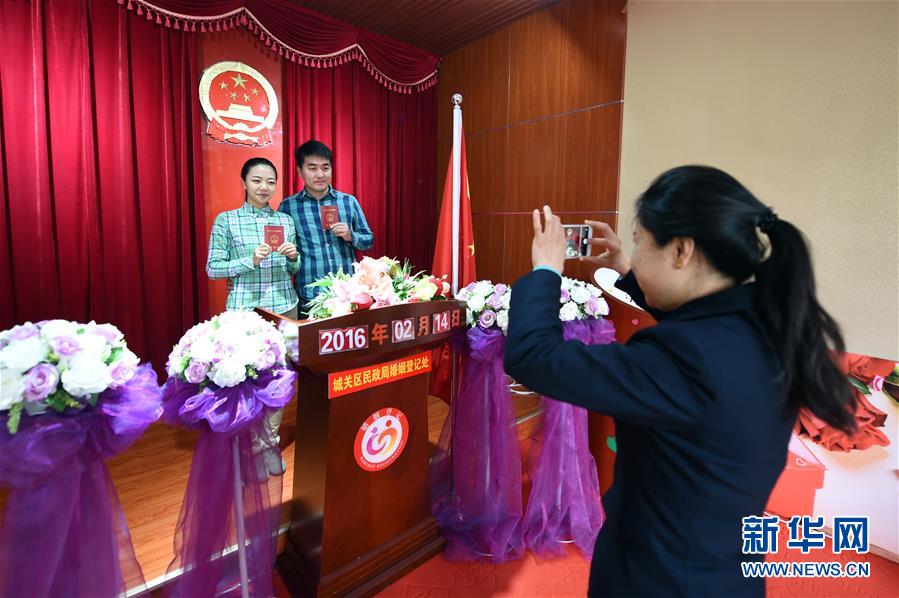2月14日,在兰州市城关区民政局婚姻登记处,一对新人领取结婚证后合影留念。当日是西方情人节,许多新人选择在这一天登记结婚,告别单身。 新华社记者 范培珅 摄