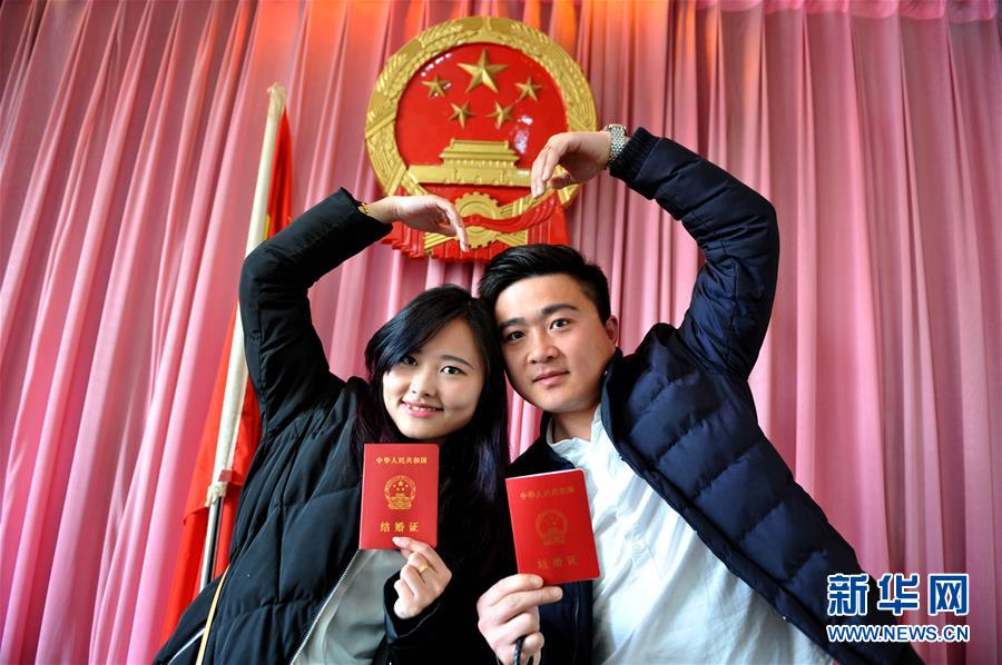 2月14日,一对刚领结婚证的新人在江苏连云港市赣榆区民政局婚姻登记处拍照留念。当日是情人节,一些情侣选择这一天办理结婚登记手续,在浪漫的氛围中见证甜蜜的爱情。 新华社发(朱代桂 摄)