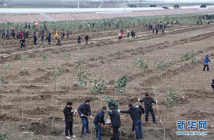 2月14日,河南省平顶山市宝丰县干部群众在南水北调中线干渠植树现场植树。当日是春节后第一个工作日,河南省平顶山市在宝丰县肖旗乡石营村南水北调中线干渠两侧展开春季植树造林活动,现场栽植苗木约3500棵。新华社发(王双正 摄)