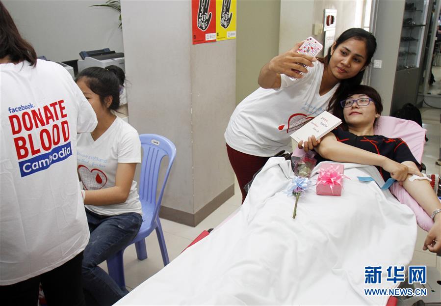 2月14日,在柬埔寨金边,一名参与献血的女子(右一)和朋友自拍。当日,柬埔寨输血中心举行第三次情人节献血活动。 新华社发(索万纳拉摄)