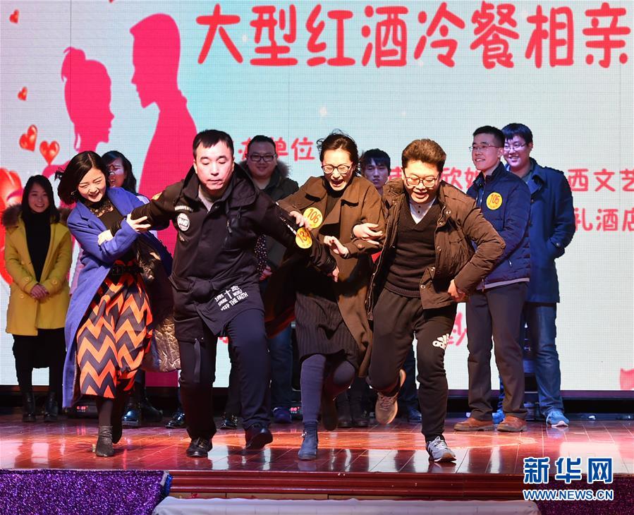 2月14日,单身青年们在参与相亲会的互动游戏。当日是西方的情人节,山西太原市桃园二巷附近一家酒店内举行了一场“情人节相亲会”,吸引了众多单身男女参加。 新华社发(曹阳 摄)