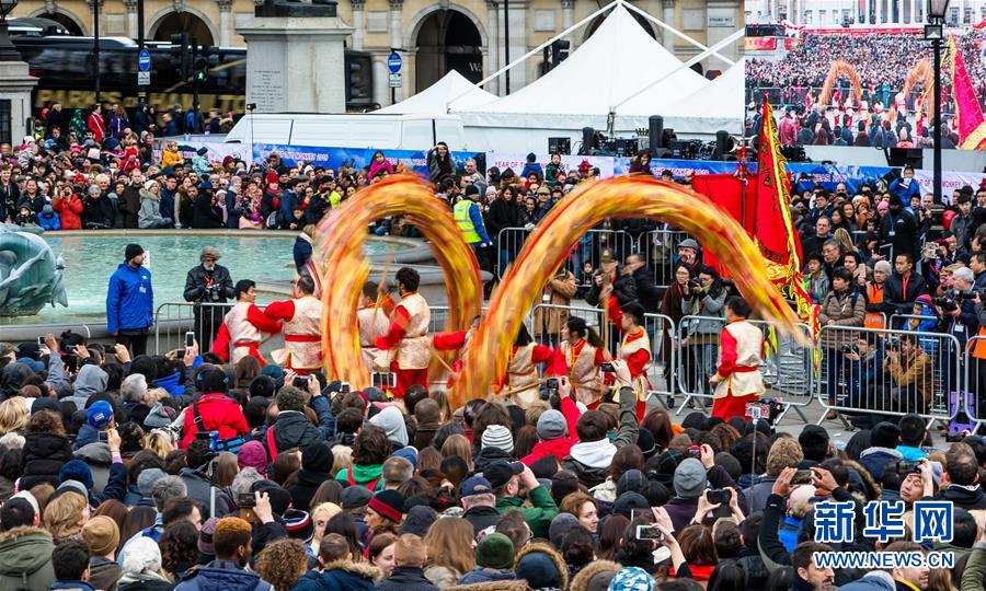 2月14日,在英国伦敦,舞龙队在庆新春游行活动上表演。当日,伦敦华埠举行新春庆典系列活动,庆祝猴年的到来。新华社发(理查德·华什布鲁克摄)