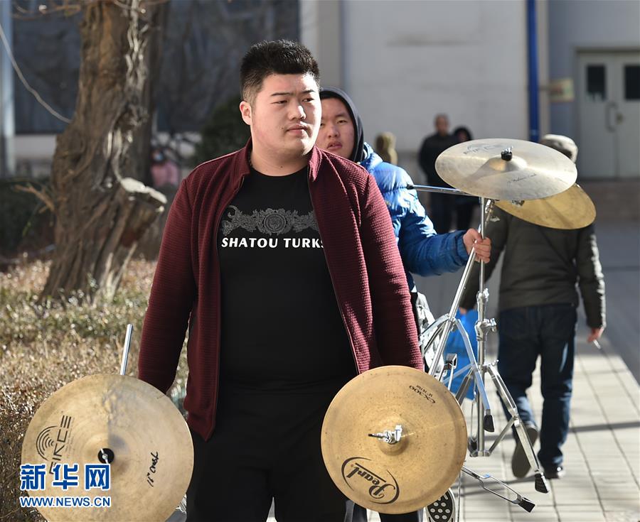 2月15日,艺考生在山西艺术职业学院考点搬运乐器。春节假期刚过,山西省声乐和舞蹈类专业的考生们来到山西艺术职业学院参加艺考。 新华社发(曹阳 摄)