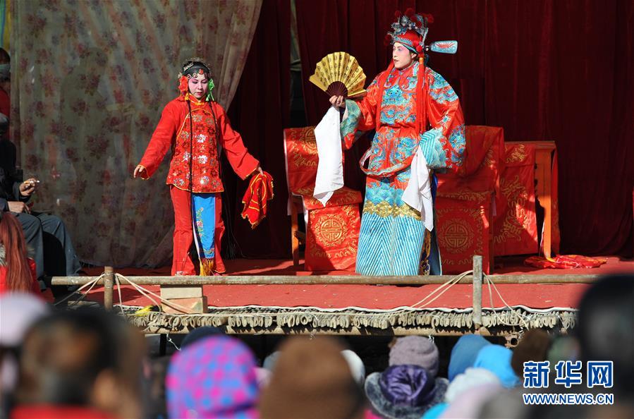 2月15日,宁夏灵武市郝家桥乡狼皮子梁移民新村草根剧团为村民表演秦腔剧目。地处毛乌素沙漠边缘的宁夏灵武市郝家桥乡狼皮子梁村是一座生态移民新村,在“十二五”期间,来自宁夏南部山区的移民陆续搬迁至此,开始了新生活。春节期间,爱好秦腔的村民组成的草根剧团为村民们免费演出,给移民新村增添了浓浓的节日气氛。新华社记者 彭昭之 摄