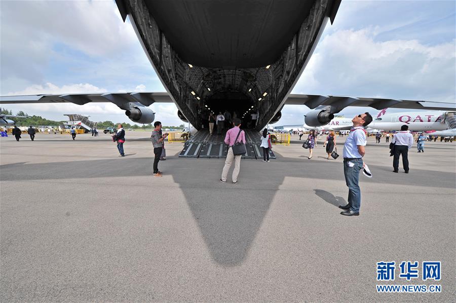 2月17日,一架美国空军C-17环球霸王III运输机在新加坡航空展上展出。两年一度的新加坡航空展于2月16日至21日在新加坡樟宜展览中心举行,其中前四天为交易日,最后两天向公众开放。 新华社发(邓智炜摄)