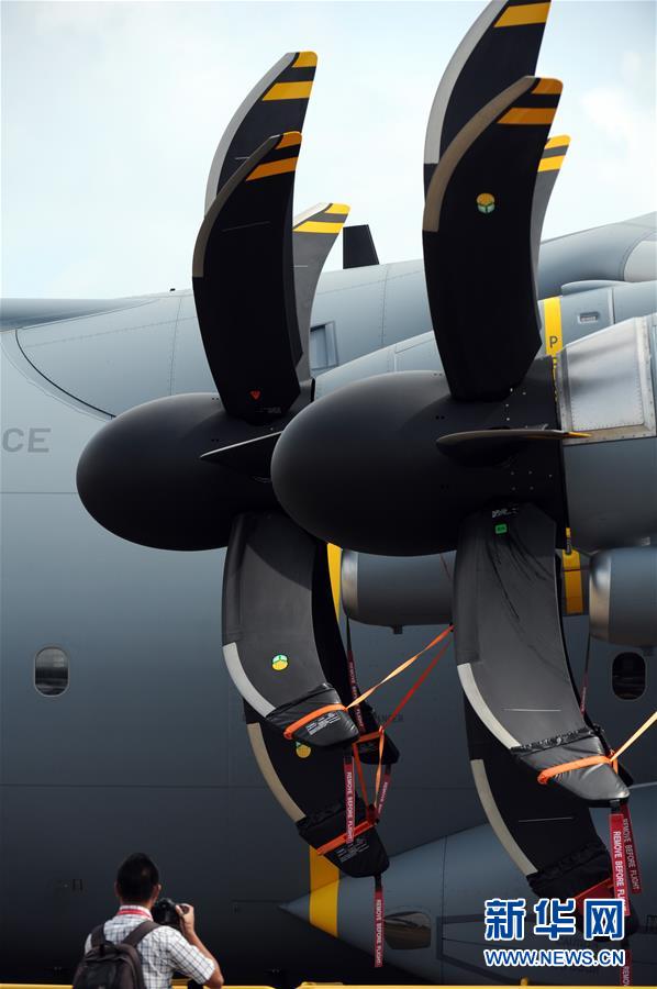 2月17日,一架马来西亚皇家空军A400M运输机在新加坡航空展上展出。两年一度的新加坡航空展于2月16日至21日在新加坡樟宜展览中心举行,其中前四天为交易日,最后两天向公众开放。 新华社发(邓智炜摄)