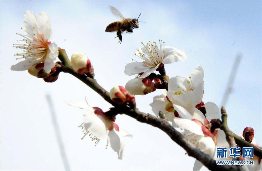 2月17日,一只蜜蜂在苏州观前公园的梅花丛中盘旋。