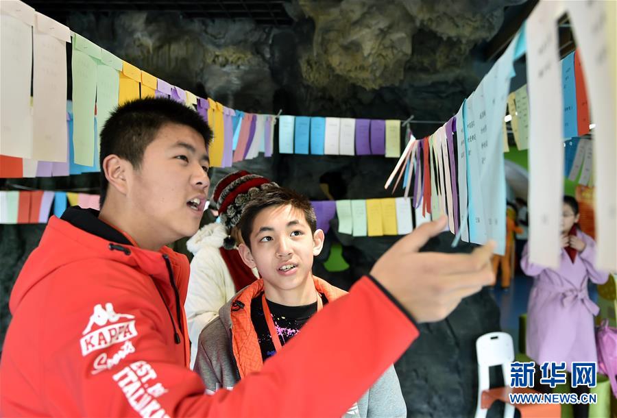 2月20日,来自济南十六里河中学的初一学生吴春雷(左)和同学一起猜灯谜。