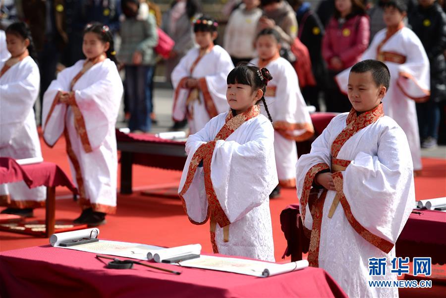 2月20日,学童们在开笔礼仪式上。当日,一场汉服开笔礼仪式在西安汉城湖举行,来自西安多个学校的55名儿童身着汉服、行汉礼、写汉字,在老师的带领下通过“朱砂开智”“击鼓鸣智”“启蒙描红”等9个步骤体验中国古代传统文化。新华社记者 刘潇 摄