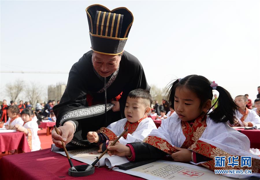 2月20日,老师在开笔礼仪式上带领学童书写汉字。当日,一场汉服开笔礼仪式在西安汉城湖举行,来自西安多个学校的55名儿童身着汉服、行汉礼、写汉字,在老师的带领下通过“朱砂开智”“击鼓鸣智”“启蒙描红”等9个步骤体验中国古代传统文化。新华社记者 刘潇 摄