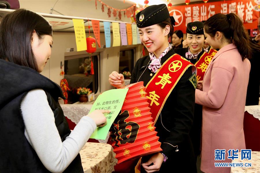 2月21日,郑州客运段的乘务员与旅客在列车上互动猜灯谜。当日,在郑州东至北京西的G90次列车上,郑州客运段的乘务员将列车布置一新,并为旅客表演节目,开展猜灯谜、赠送纪念品等活动,让旅客在旅途中感受到传统元宵佳节的氛围。新华社记者李安摄
