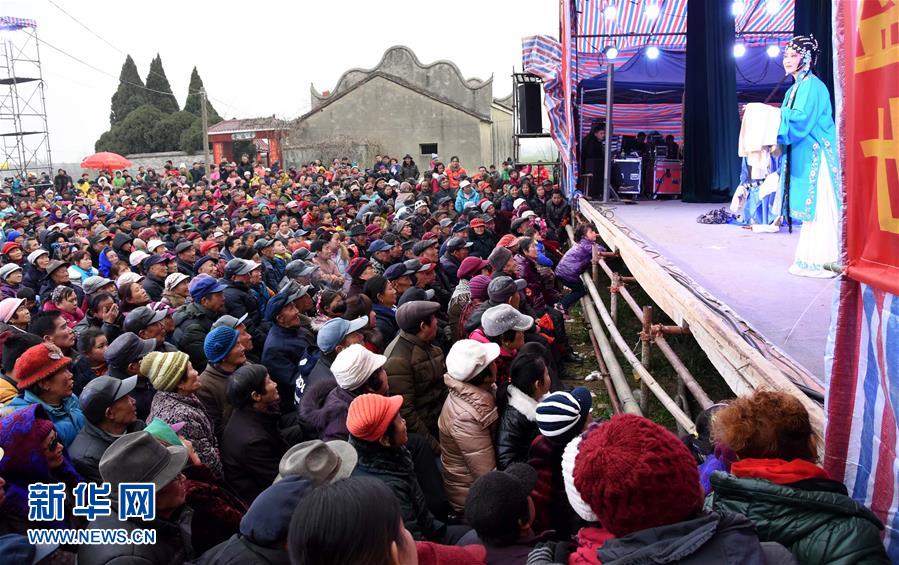 2月21日,湖北黄梅县李英乡黄锡村村民在观看黄梅戏。为丰富农民的春节生活,湖北省黄梅戏剧院组织64名演员来到黄冈市黄梅县李英乡黄锡村,开展送戏下乡演出活动。正月十二至正月十六期间,该村每天上演三场大戏,吸引周边数千村民前来观看。新华社记者周科摄