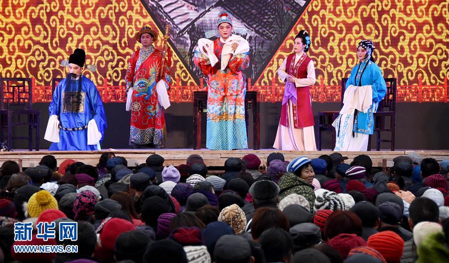 2月21日,湖北省黄梅戏剧院演员在黄梅县李英乡黄锡村为村民表演黄梅戏《罗帕记》。新华社记者周科摄
