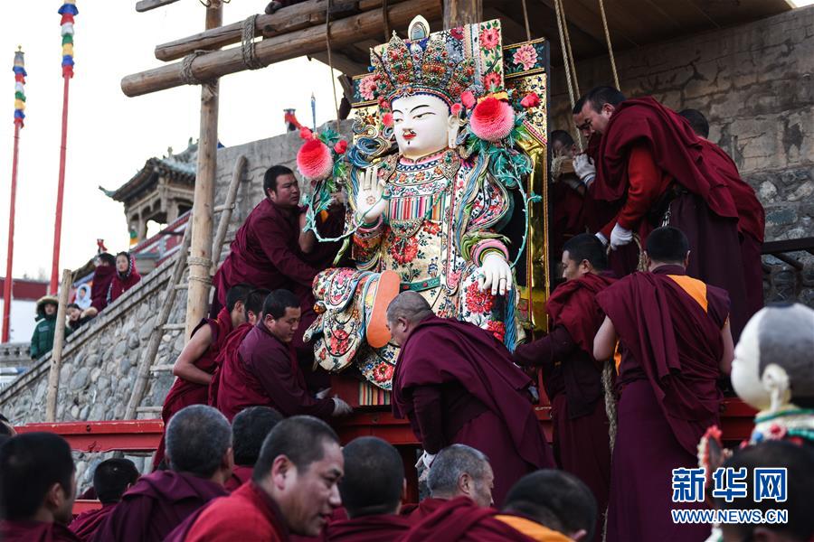 2月22日,几名塔尔寺的僧人将做好的酥油花抬向展台。当日,位于青海省西宁市湟中县境内的藏传佛教名寺塔尔寺举行酥油花展,吸引众多游客前来参观。酥油花是塔尔寺“艺术三绝”之一,由寺院艺僧以酥油为原料精雕细捏而成,以神像、人物、飞禽走兽、花草树木等为主要内容,形象逼真、色彩丰富,具有很高的艺术水平和独特的艺术魅力。新华社记者 吴刚 摄