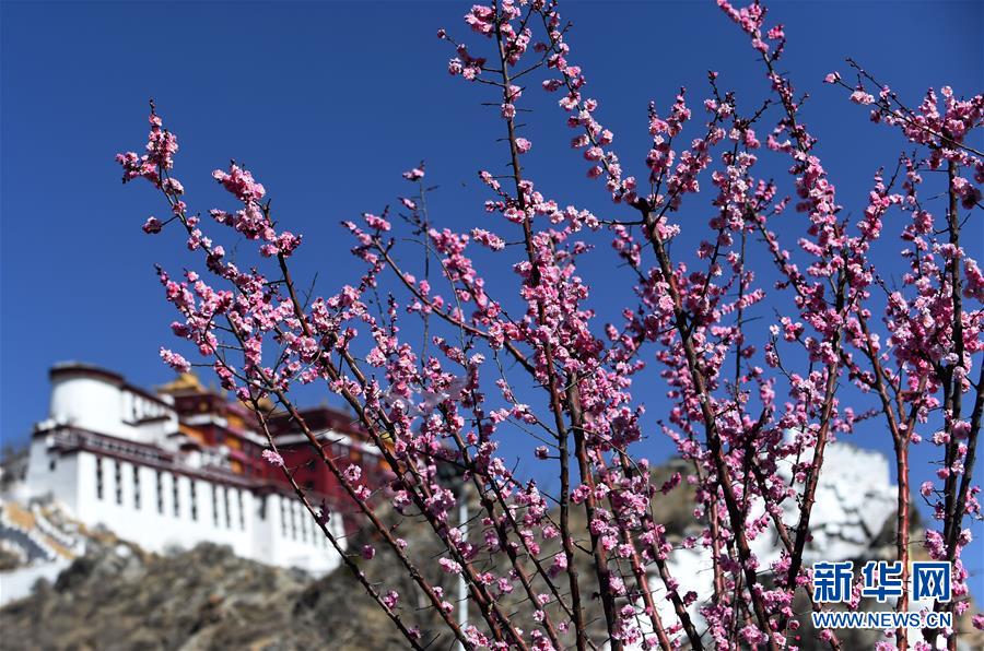 2月22日拍摄的桃花映衬下布达拉宫。 随着天气逐渐转暖,西藏拉萨万物复苏,春意渐浓。新华社记者 觉果 摄
