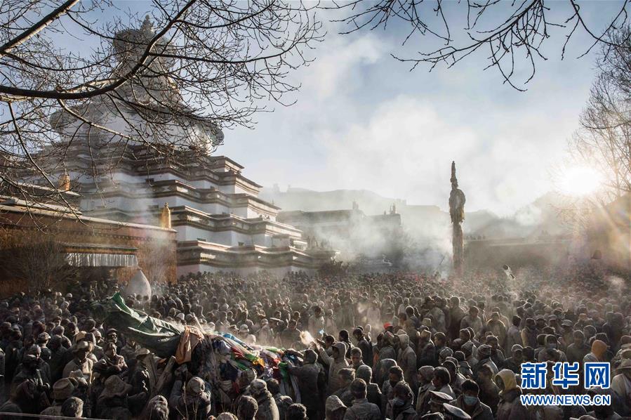 2月22日,日喀则江孜县白居寺广场举行“立经幡杆”宗教佛事活动。当日是藏历正月十五,一年一度的西藏日喀则江孜县白居寺等七座寺庙“立经幡杆”宗教佛事活动举行。来自四面八方的藏族群众互撒糌粑,祈福新年风调雨顺、五谷丰登。新华社记者 普布扎西 摄