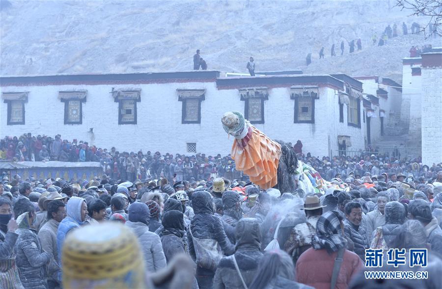 2月22日,日喀则江孜县白居寺广场举行“立经幡杆”宗教佛事活动。当日是藏历正月十五,一年一度的西藏日喀则江孜县白居寺等七座寺庙“立经幡杆”宗教佛事活动举行。来自四面八方的藏族群众互撒糌粑,祈福新年风调雨顺、五谷丰登。新华社记者 刘东君 摄
