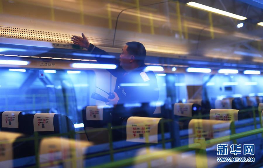 2月23日,赵金对动车车厢内的行李架卫生进行检查。