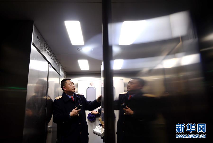 2月23日,赵金对动车餐厅的橱柜进行检查。