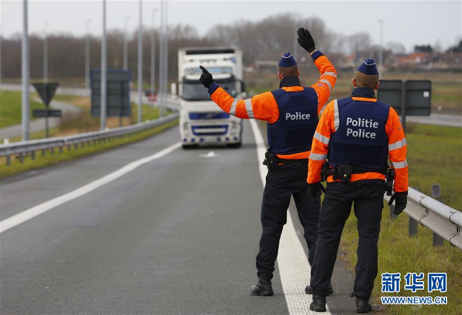 2月24日,在比利时靠近与法国边境的阿丁凯尔克小镇,比利时警方拦截卡车进行检查。因担心法国清理位于加莱郊区的难民营导致难民涌入比利时境内,比利时政府23日晚间宣布临时性加强比法边境的检查措施。 新华社记者叶平凡摄