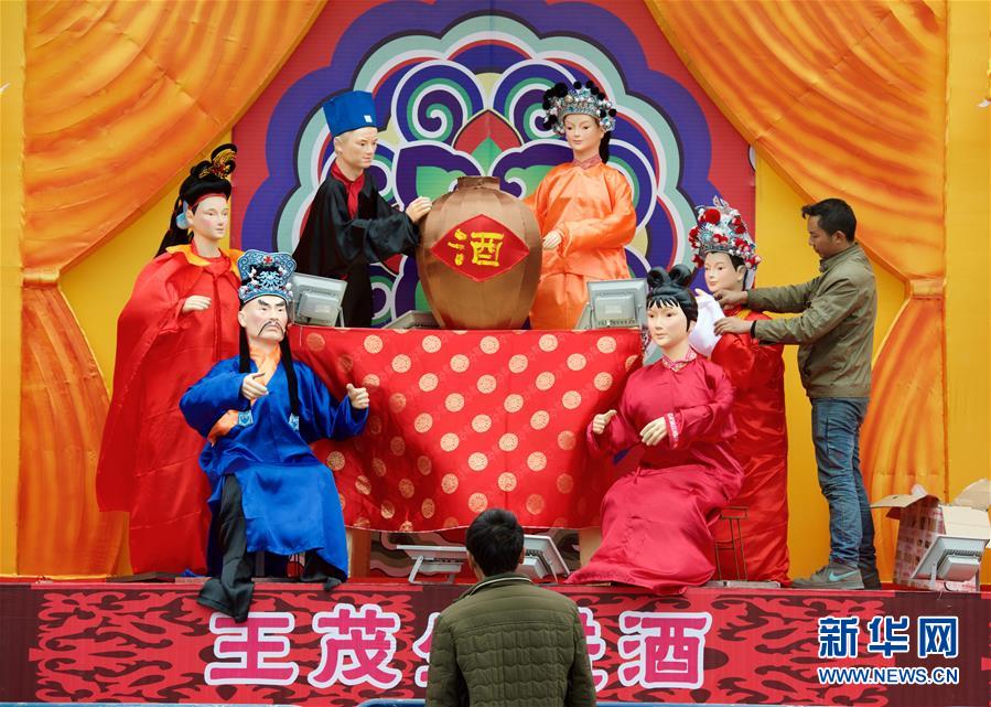 2月17日,泉州吴氏花灯员工罗维(右)为福州仓山区灯会布置闽剧灯组“王茂生进酒”。当日,2016年福建省福州市元宵灯会布展完毕并试亮灯。本届灯会以“灯耀闽江·福运神州”为主题,福州鼓楼、台江、仓山、晋安、马尾等五城区沿闽江两岸布置了5个分区主题灯会,展现了各城区地域特色和人文景观。新华社记者姜克红摄