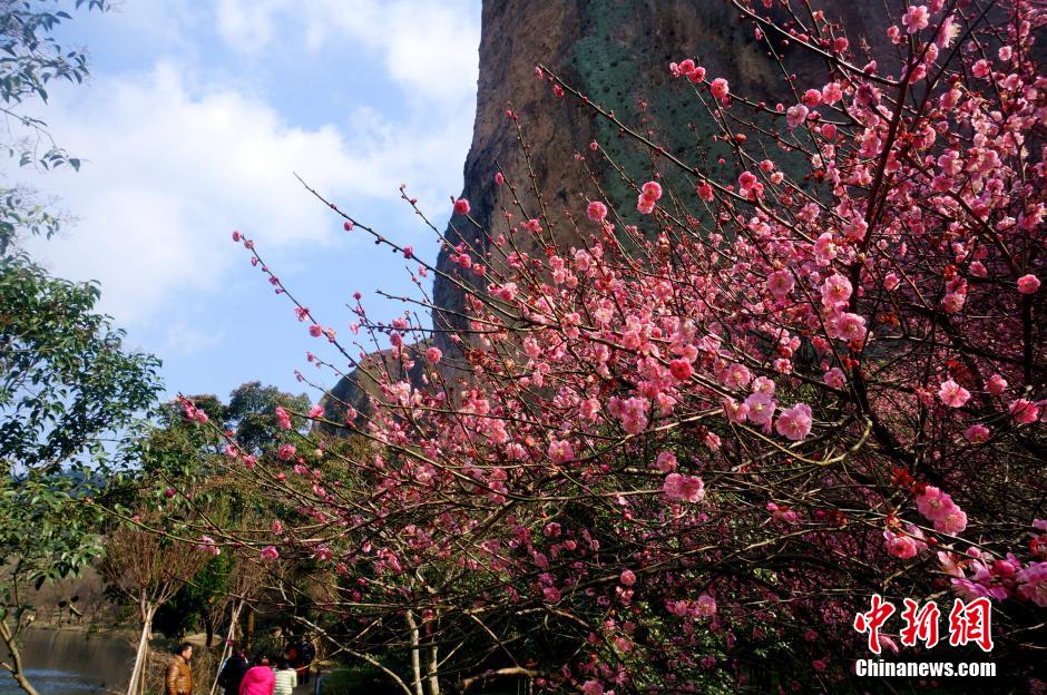 2月15日,浙江缙云仙都景区风和日丽,鼎湖峰下的红梅、白梅竞相绽放,游客寻香探梅络绎不绝。 中新社记者 詹坚宇 摄
