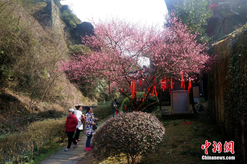浙江仙都红梅俏“立”枝头 游客络绎不绝