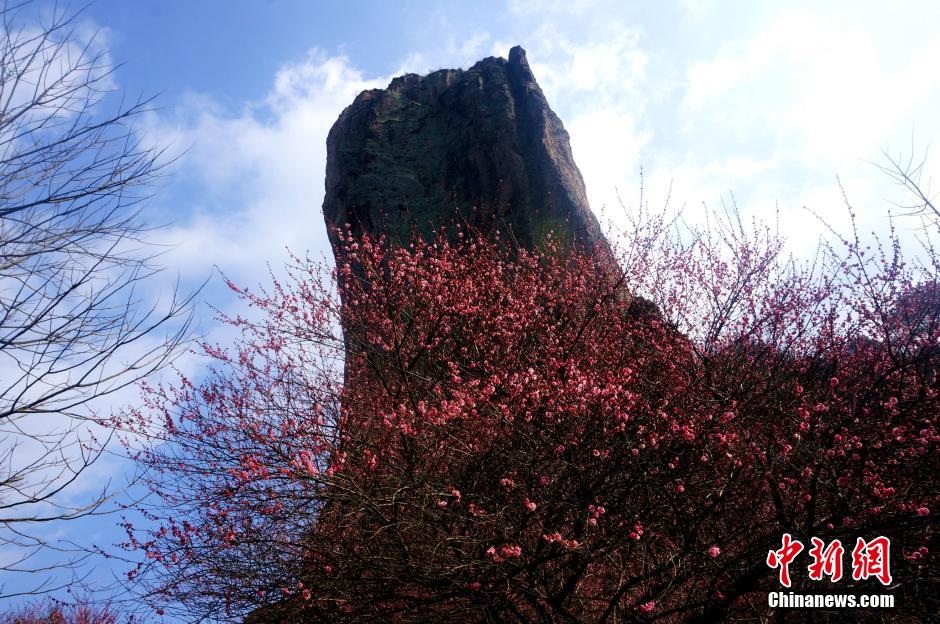 2月15日,浙江缙云仙都景区风和日丽,鼎湖峰下的红梅、白梅竞相绽放,游客寻香探梅络绎不绝。 中新社记者 詹坚宇 摄