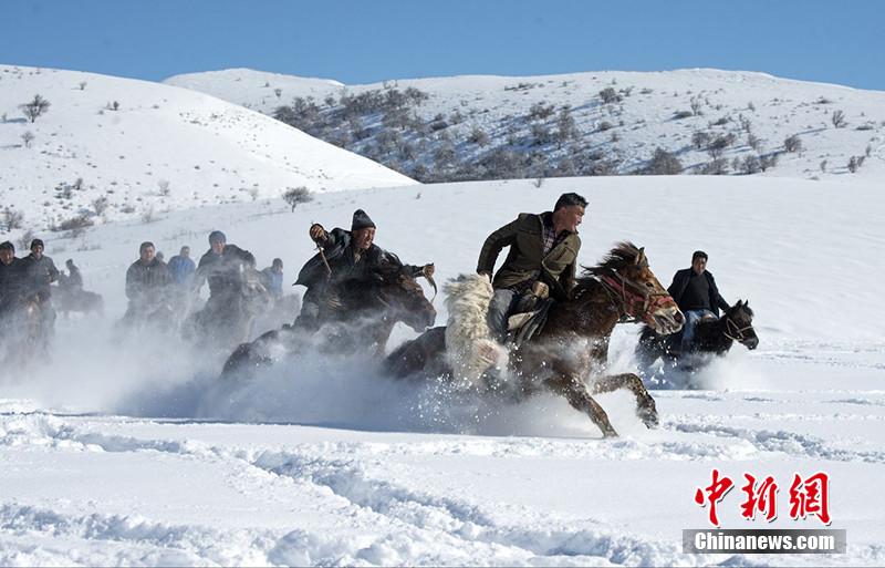 2月14日,新疆霍城县在当地著名风景区大西沟福寿山举办哈萨克族牧民雪上刁羊比赛。