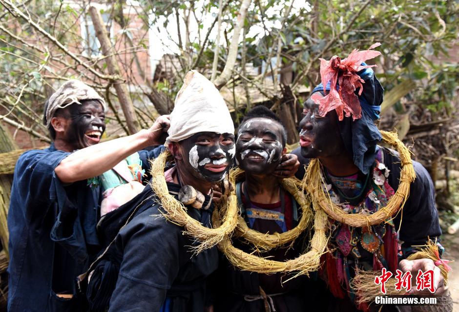 2月15日农历正月初八,位于黔桂交界的广西三江侗族自治县梅林乡石碑村举办古老民俗活动“抬官人”,该村群众以抬官人、踩歌堂、侗族耶歌等特色节目喜闹新春。“抬官人”侗语为“掂宁蒙”,村民们化成黑色的花脸,手舞足蹈的在村中巡游,夸张再现过去的社会现象和传说,具有浓重的喜剧色彩。图为化成黑色花脸的村民。 龚普康 摄