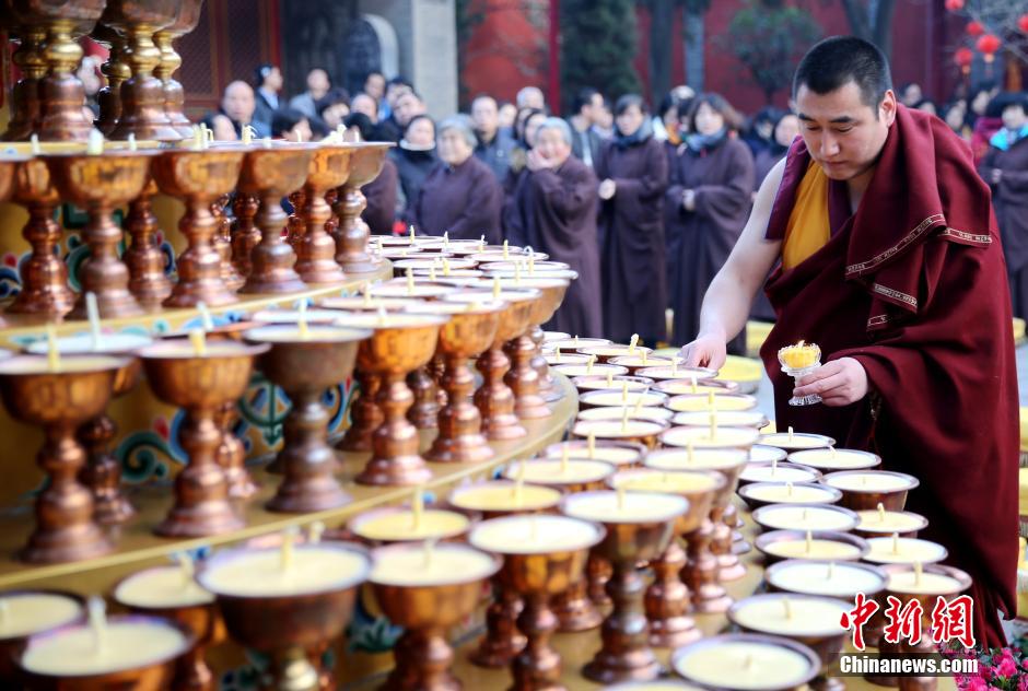 2月15日是农历正月初八,万余民众当晚汇聚陕西境内唯一的喇嘛寺庙西安广仁寺,参加“中国梦 吉祥梦”新春祈福灯会。住持仁钦上师带领民众点燃十万盏酥油灯,念经、绕寺、转塔祈福。祈祷国泰民安,社会和谐,世界和平。图为一位喇嘛点燃酥油灯。 张远 摄
