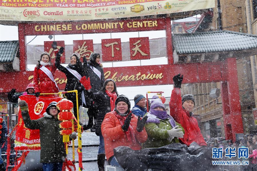 2月14日,在美国芝加哥中国城,一辆花车通过春节大游行现场。 当日,芝加哥中国城举行一年一度的春节大游行。 新华社发(张大卫摄)