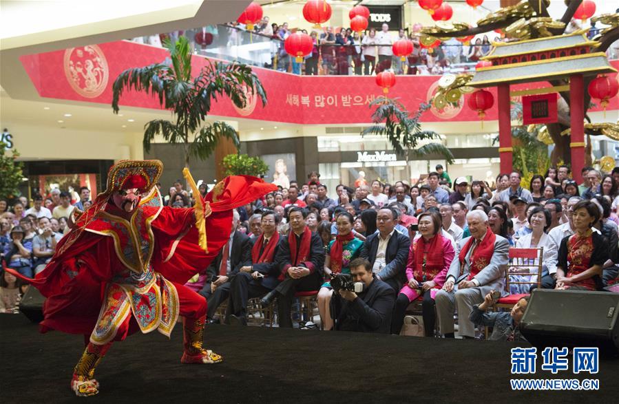2月14日,在美国加利福尼亚州科斯塔梅萨的一家商场,中国演员表演川剧变脸。春节期间,加利福尼亚州多个商场通过布置中国风格装饰、举办文化活动等方式庆祝中国农历新年。 新华社记者杨磊摄
