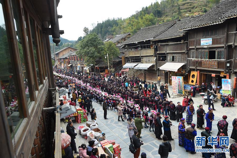 2月15日,参加祭祀活动的侗族同胞经过肇兴侗寨。当日,一场传统的祭祀“萨玛”神活动在贵州省黔东南州黎平县肇兴侗寨举行。肇兴侗寨内的千余户侗族同胞身着盛装,在寨老、祭师的引领下对“萨玛”神进行祭拜。据了解,“萨玛”是侗族早在母系氏族社会时的一位女英雄,侗语意为“大祖母”,“萨玛”文化传承至今已有上千年历史。2006年,侗族萨玛节被列入第一批国家非物质文化遗产名录。新华社记者 刘续摄
