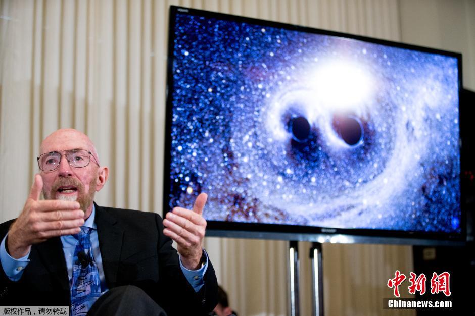 图为激光干涉引力波天文台(LIGO)联合创始人Kip Thorne在介绍合并的黑洞。