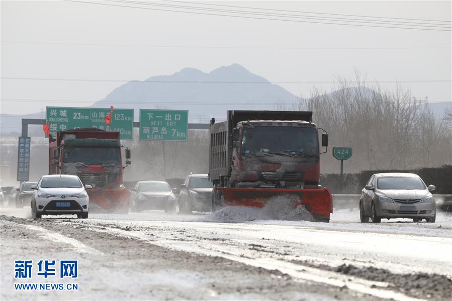2月13日,除雪车在京哈高速公路辽宁葫芦岛段进行除雪作业。
