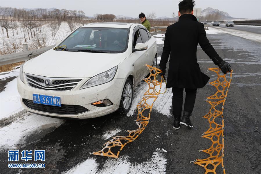 2月13日,在京哈高速公路辽宁葫芦岛段,一名司机准备为车辆安装防滑链。新华社发(田嘉 摄)