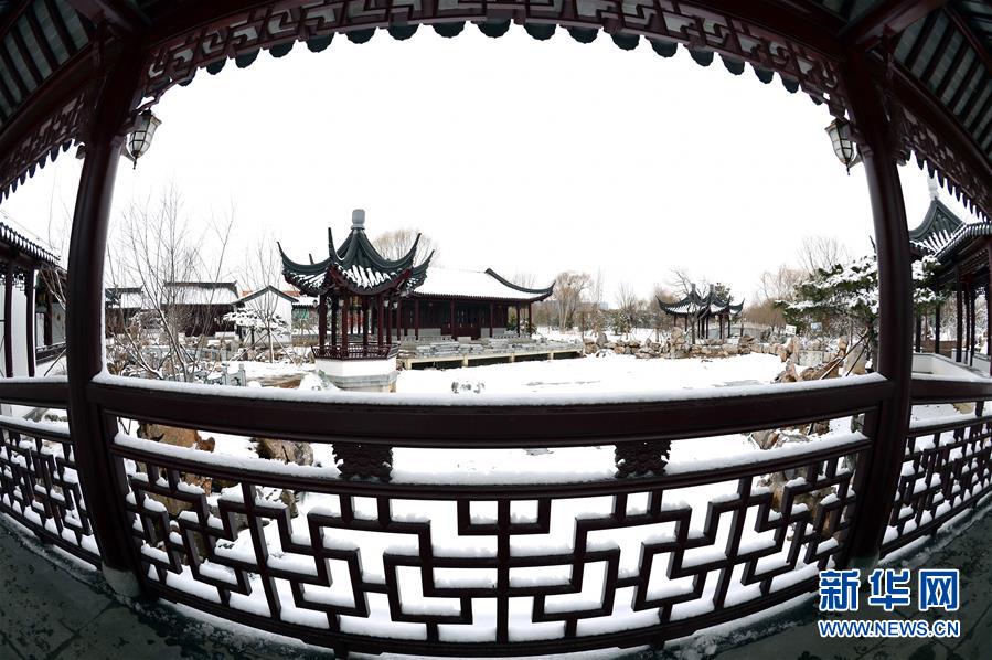 这是唐山世园会江南园(2月13日摄)。 2月13日,河北省唐山市迎来降雪,建设中的唐山世园会会址银装素裹,在白雪的衬托下更显美丽。 新华社发(董军 摄)