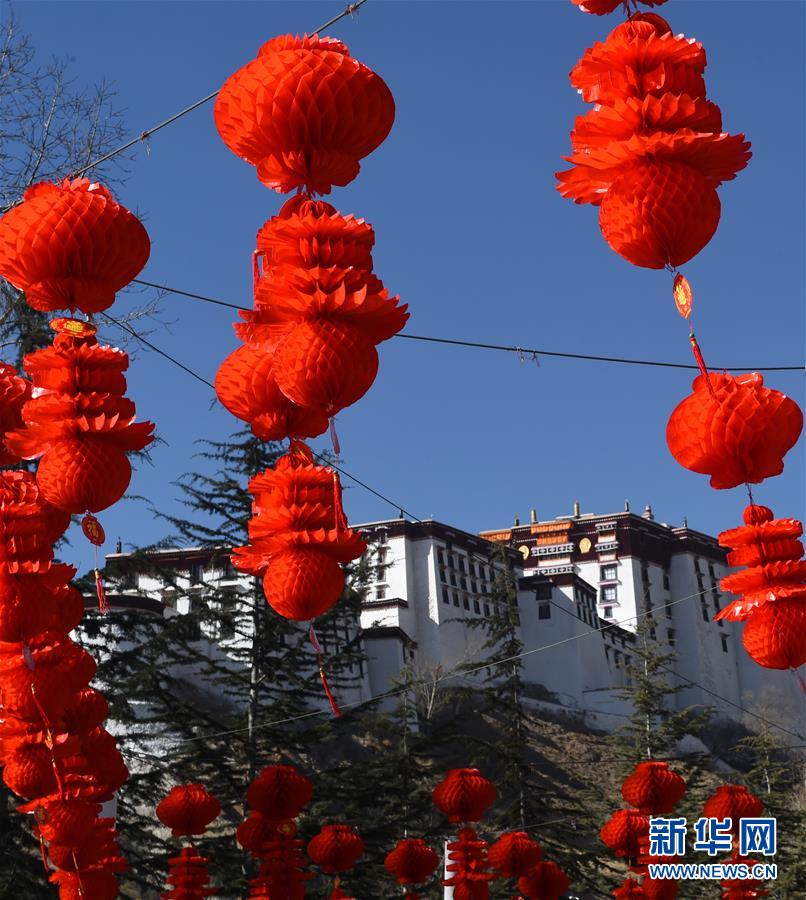 拉萨城内,大红灯笼高高挂起(2月2日摄)。随着农历猴年春节和藏历火猴新年即将到来,布达拉宫广场及拉萨街头装饰一新,充满节日喜庆气氛。 新华社记者 觉果 摄