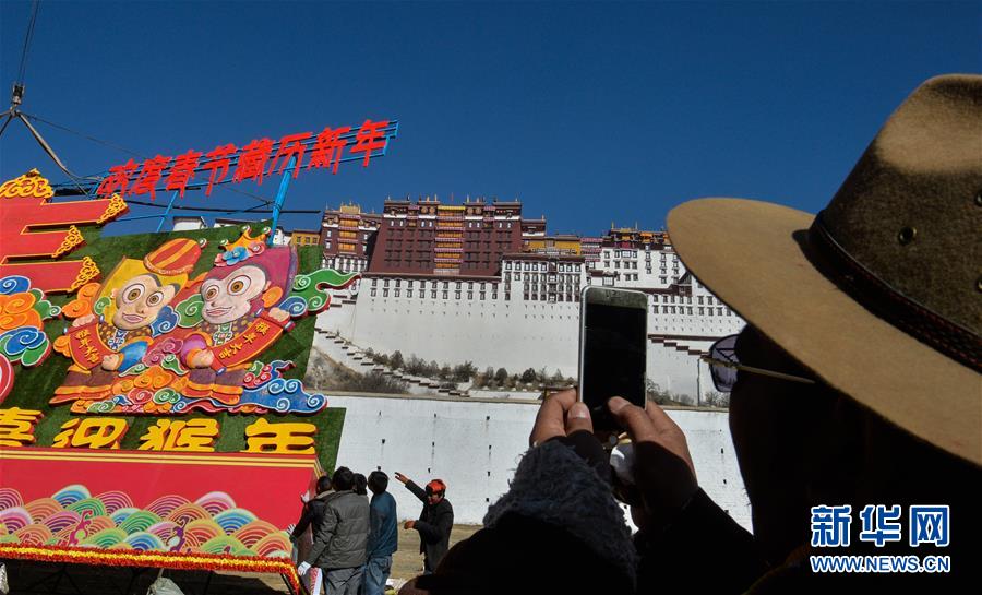 2月3日,藏族群众在装点一新的布达拉宫广场拍照。随着农历猴年春节和藏历火猴新年即将到来,布达拉宫广场及拉萨街头装饰一新,充满节日喜庆气氛。 新华社记者 普布扎西 摄