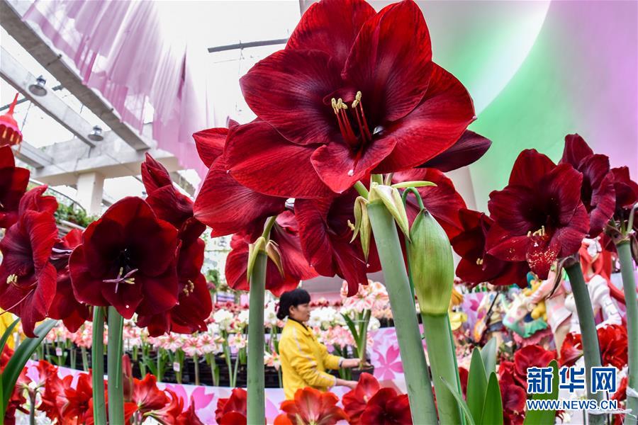 2月3日,广州百万葵园的一名园丁从绽放的朱顶红花丛中经过。春节临近,广州市南沙百万葵园从荷兰引种的万株朱顶红竞相绽放。 新华社记者 刘大伟 摄