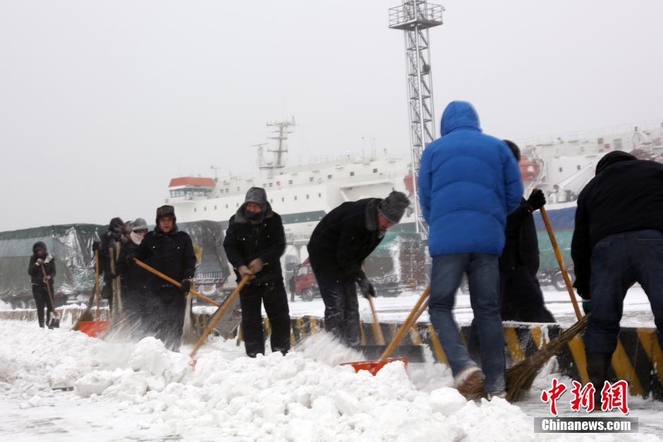 烟台港工作人员正在清理码头积雪。 胡佩民 摄
