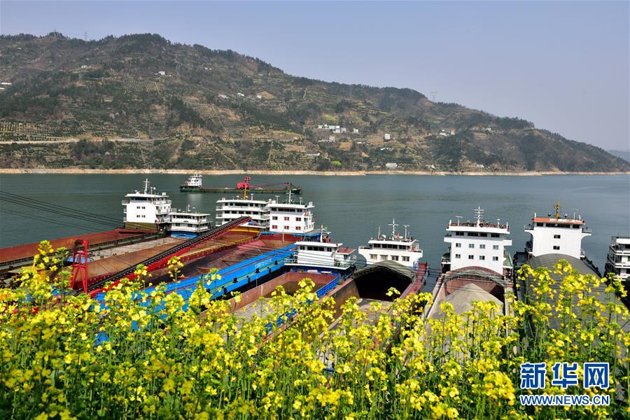 2月28日,船舶停靠在三峡大坝上游沙湾锚地等待过闸。随着气温升高,长江三峡沿岸的各色山花、油菜花陆续开放。碧绿的江水、烂漫的春花与江面上行驶的船只构成美丽的图画。 新华社发(王家满 摄)