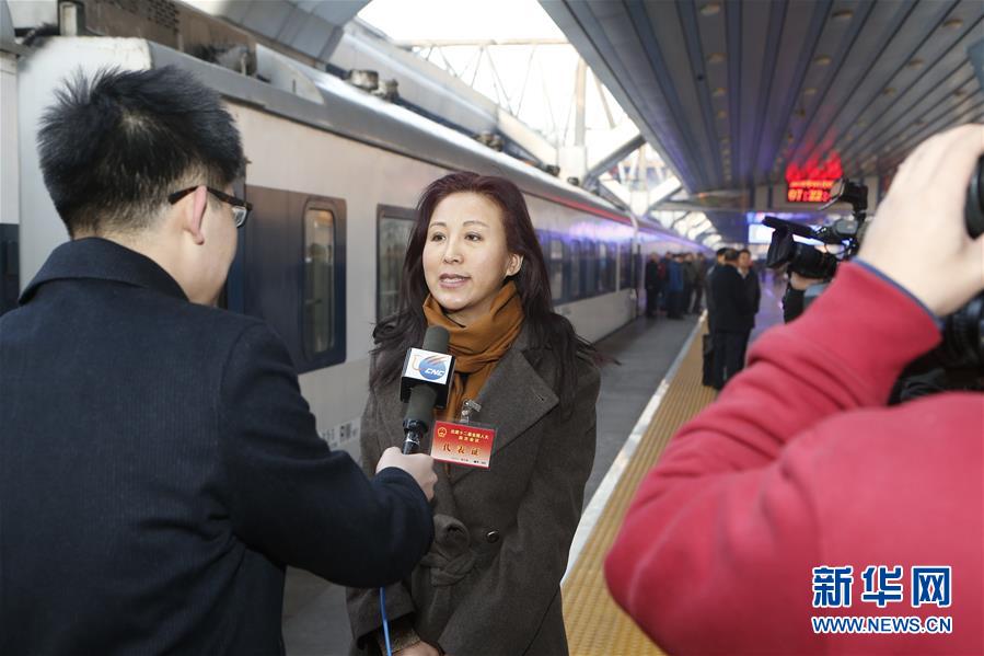 3月2日,全国人大代表苏艳霞在北京站接受记者采访。当日,出席十二届全国人大四次会议的黑龙江代表团乘坐火车抵达北京站。 新华社记者吕迅摄