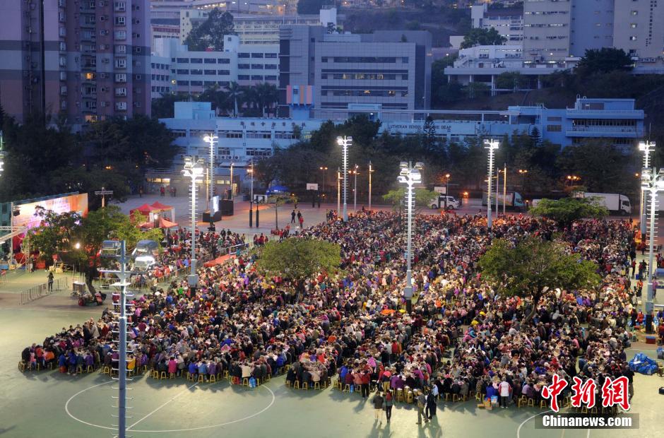 3月1日傍晚,香港葵青区议会等机构在葵涌运动场举行“万众同心千岁宴”,有四千多位长者享用盆菜宴。中新社记者 谭达明 摄