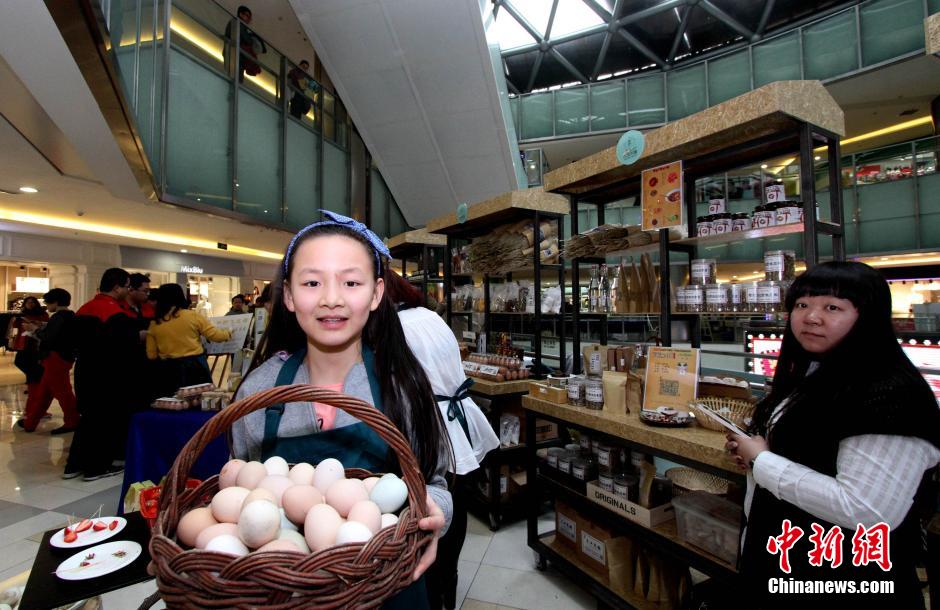 3月12日,天津,一场名为“春春欲动”的“农本市集”在水游城商场正式开集。此次集市注重阳光、空气、水的有机生态延展,再造人与自然的美好关系,让人们在忙碌的都市生活中学会健康的生活方式,感受回归、绿色、生态的生活理念。图为一个小女孩帮助父母展示自家店铺的蛋类商品。 张道正 摄