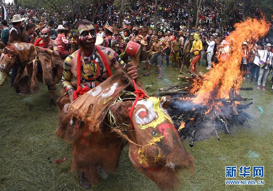 3月11日,彝族男子骑着“假马”参加祭火活动。当日是农历二月初三,居住在云南省红河哈尼族彝族自治州弥勒市西一镇的彝族阿细人迎来了一年一度的祭火节。人们齐聚红万村载歌载舞,欢庆节日。阿细人是彝族支系之一,主要居住在云南弥勒、石林和泸西等地。阿细人崇尚火,为了纪念彝族传说中钻木取火的“火神”木邓,在每年的农历二月初三,当地都要举行盛大的祭祀活动。如今每年的阿细祭火节都会吸引数万名当地群众和外地游客参加。新华社记者 蔺以光 摄