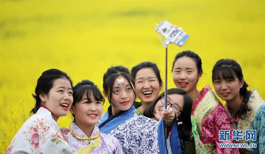 3月12日,游客穿上古装在重庆市永川区青峰镇的油菜花田中留影。春风拂面时,菜花飘香至。近期,我国南方各地油菜花相继盛开,田野间金黄画卷映入眼帘,吸引人们踏青游玩,品味春意。 新华社发(陈仕川 摄)