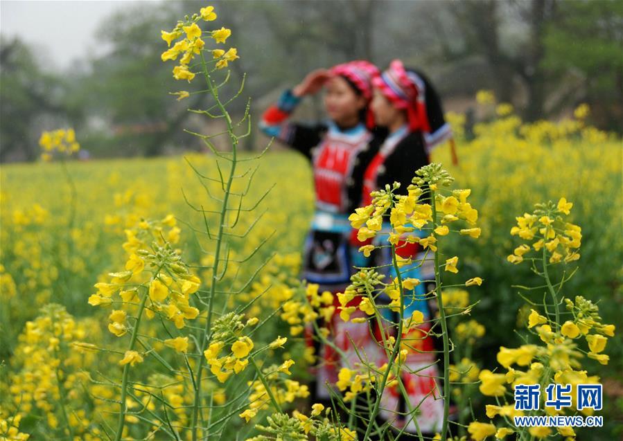 3月12日,两名瑶族姑娘在广西富川瑶族自治县深坡村田野间欣赏盛开的油菜花。春风拂面时,菜花飘香至。近期,我国南方各地油菜花相继盛开,田野间金黄画卷映入眼帘,吸引人们踏青游玩,品味春意。 新华社发(廖祖平 摄)