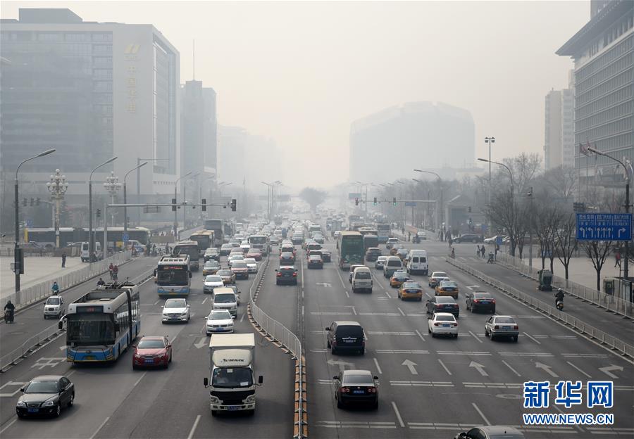 雾霾笼罩下的街道(3月17日摄)。 3月17日,北京空气重污染黄色预警及霾黄色预警继续。北京市气象台、北京市环保监测中心16日联合研判,随着冷空气结束,本周京津冀将出现2016年以来持续时间最长的重污染过程,17日-18日污染最重,空气质量达5级重度污染,预计19日有所缓解,至22日逐渐消散。新华社记者张晨霖摄